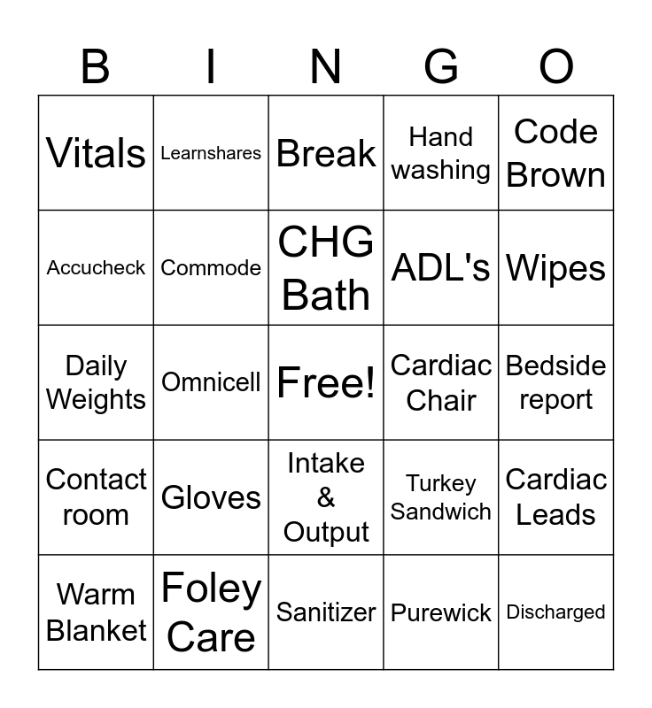 This bingo card has a free space and 25 words: Gloves, Sanitizer, CHG Bath, Warm Blanket, Code Brown, Vitals, Accucheck, Learnshares, Cardiac Chair, Intake & Output, ADL's, Daily Weights, Turkey Sandwich, Cardiac Leads, Commode, Huddle, Bedside report, Break, Wipes, Omnicell, Discharged, Foley Care, Contact room, Hand washing and Purewick.