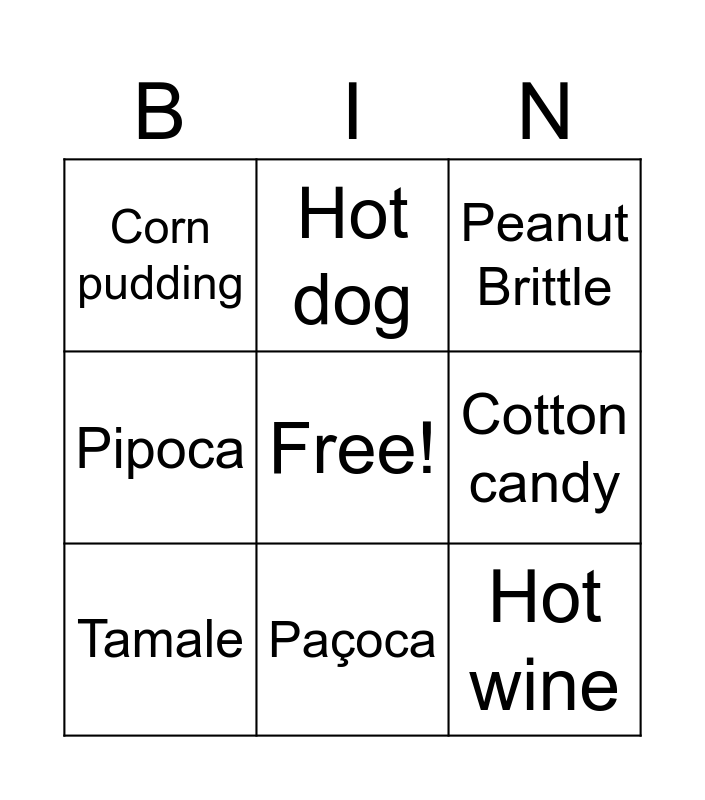 This bingo card has a free space and 19 words: Corn cake, Peanut, Peanut Brittle, Cassava cake, Brazilian Grog, Hot wine, Tapioca, Corn pudding, Hot dog, Caldo verde, Candy apple, Cotton candy, Tamale, Rice pudding, Corn Pudding, Corn on the cob, Pipoca, Paçoca and Dulce de Leche.