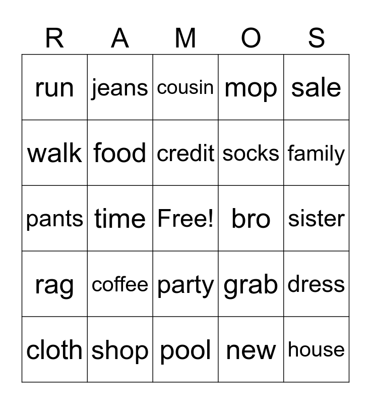 This bingo card has a free space and 24 words: coffee, shop, credit, cloth, sale, run, walk, jeans, bro, party, socks, pants, grab, dress, food, new, sister, cousin, family, time, house, rag, mop and pool.