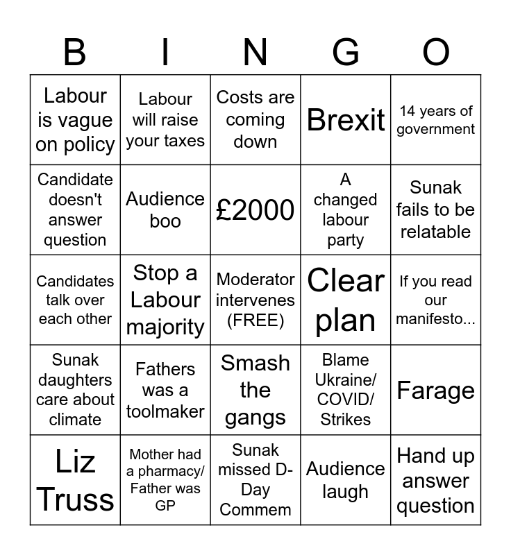 This bingo card has a free space and 24 words: Fathers was a toolmaker, Mother had a pharmacy/ Father was GP, £2000, Liz Truss, 14 years of government, Labour is vague on policy, Candidate doesn't answer question, Labour will raise your taxes, Clear plan, Smash the gangs, A changed labour party, Candidates talk over each other, Blame Ukraine/ COVID/ Strikes, Farage, Audience boo, Audience laugh, If you read our manifesto..., Costs are coming down, Sunak fails to be relatable, Stop a Labour majority, Hand up answer question, Sunak daughters care about climate, Brexit and Sunak missed D-Day Commem.