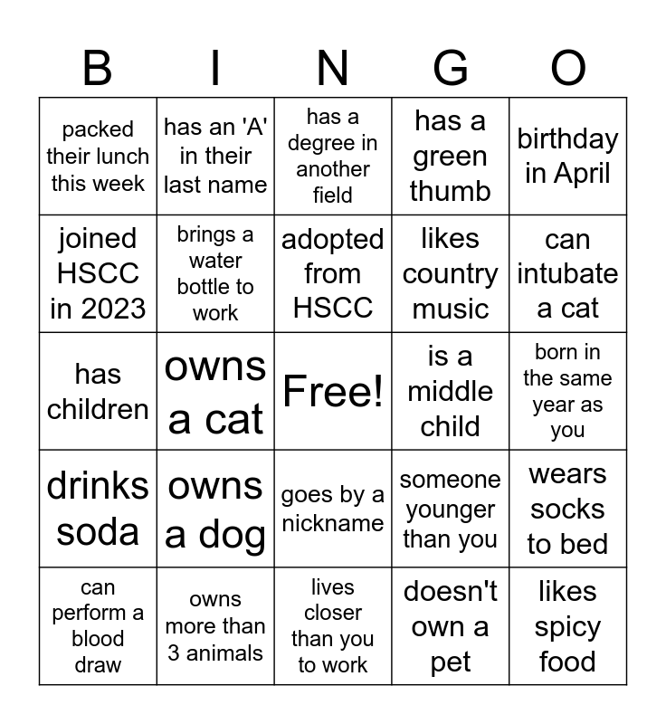This bingo card has a free space and 24 words: owns a dog, owns more than 3 animals, adopted from HSCC, can perform a blood draw, birthday in April, packed their lunch this week, joined HSCC in 2023, has an 'A' in their last name, is a middle child, goes by a nickname, likes country music, has children, someone younger than you, wears socks to bed, brings a water bottle to work, doesn't own a pet, born in the same year as you, has a degree in another field, can intubate a cat, owns a cat, likes spicy food, drinks soda, has a green thumb and lives closer than you to work.