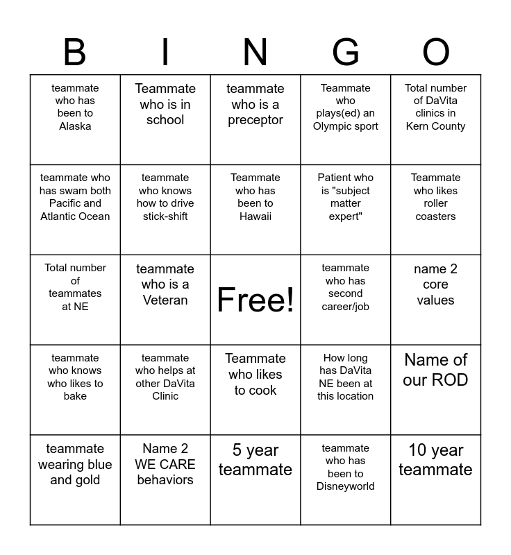 This bingo card has a free space and 29 words: teammate wearing blue and gold, teammate belongs to a sports team, teammate who is a Veteran, teammate who has gone horseback riding, teammate who has been to Alaska, teammate who is a preceptor, teammate who knows how to drive stick-shift, teammate who helps at other DaVita Clinic, teammate who has second career/job, Name 2 WE CARE behaviors, name 2 core values, 10 year teammate, 5 year teammate, teammate who has been to Disneyworld, Teammate who likes roller coasters, Teammate who has been to Europe, Teammate who likes to cook, teammate who knows who likes to bake, Total number of DaVita clinics in Kern County, Total number of teammates at NE, How long has DaVita NE been at this location, less than 1 year teammate, Patient who is "subject matter expert", teammate who has swam both Pacific and Atlantic Ocean, Teammate who plays(ed) an Olympic sport, Teammate who is in school, Name of our ROD, Teammate who has been to Hawaii and teammate who sung has karaoke.
