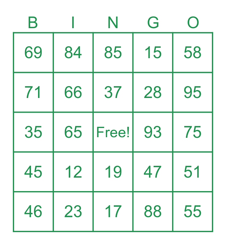 This bingo card has a free space and 24 words: 12, 23, 37, 46, 58, 69, 71, 84, 93, 19, 28, 35, 47, 51, 66, 88, 75, 85, 95, 65, 55, 45, 15 and 17.