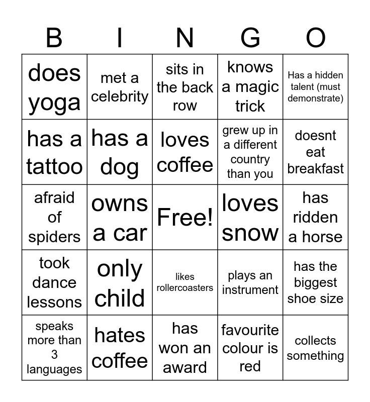 This bingo card has a free space and 24 words: only child, hates coffee, loves coffee, speaks more than 3 languages, Has a hidden talent (must demonstrate), does yoga, has a tattoo, met a celebrity, loves snow, likes rollercoasters, grew up in a different country than you, afraid of spiders, plays an instrument, has the biggest shoe size, has a dog, favourite colour is red, has ridden a horse, sits in the back row, doesnt eat breakfast, owns a car, collects something, took dance lessons, knows a magic trick and has won an award.