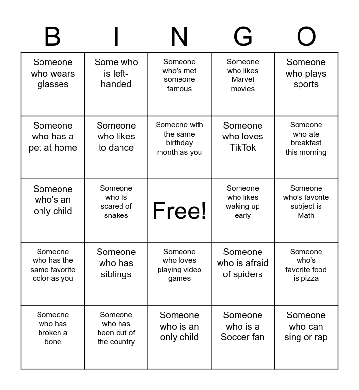 This bingo card has a free space and 24 words: Someone who has siblings, Someone who has been out of the country, Someone with the same birthday month as you, Someone who has broken a bone, Someone who plays sports, Someone who wears glasses, Someone who has a pet at home, Some who is left-handed, Someone who likes waking up early, Someone who loves playing video games, Someone who loves TikTok, Someone who's an only child, Someone who is afraid of spiders, Someone who's favorite food is pizza, Someone who likes to dance, Someone who is a Soccer fan, Someone who's favorite subject is Math, Someone who's met someone famous, Someone who ate breakfast this morning, Someone who Is scared of snakes, Someone who can sing or rap, Someone who has the same favorite color as you, Someone who likes Marvel movies and Someone who is an only child.