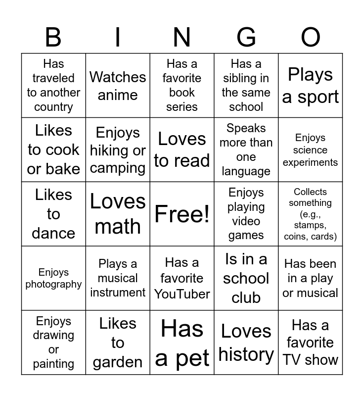 This bingo card has a free space and 25 words: Plays a musical instrument, Has a pet, Loves to read, Enjoys drawing or painting, Plays a sport, Has traveled to another country, Likes to cook or bake, Watches anime, Enjoys playing video games, Has a favorite YouTuber, Speaks more than one language, Likes to dance, Is in a school club, Has been in a play or musical, Enjoys hiking or camping, Likes to write stories or poetry, Collects something (e.g., stamps, coins, cards), Has a favorite book series, Enjoys science experiments, Loves math, Has a favorite TV show, Likes to garden, Enjoys photography, Has a sibling in the same school and Loves history.