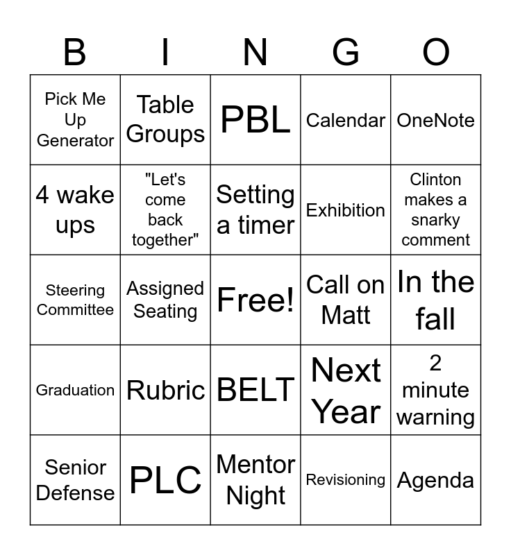 This bingo card has a free space and 24 words: Rubric, PLC, Setting a timer, Senior Defense, OneNote, Pick Me Up Generator, 4 wake ups, Table Groups, Call on Matt, BELT, Exhibition, Steering Committee, Next Year, 2 minute warning, "Let's come back together", Revisioning, In the fall, PBL, Clinton makes a snarky comment, Assigned Seating, Agenda, Graduation, Calendar and Mentor Night.