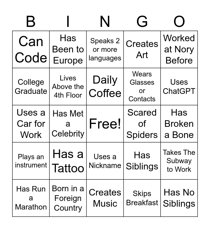 This bingo card has a free space and 24 words: Has a Tattoo, Born in a Foreign Country, Daily Coffee, Has Run a Marathon, Worked at Nory Before, Can Code, College Graduate, Has Been to Europe, Scared of Spiders, Uses a Nickname, Wears Glasses or Contacts, Uses a Car for Work, Has Siblings, Takes The Subway to Work, Lives Above the 4th Floor, Skips Breakfast, Has Broken a Bone, Speaks 2 or more languages, Uses ChatGPT, Has Met a Celebrity, Has No Siblings, Plays an instrument, Creates Art and Creates Music.