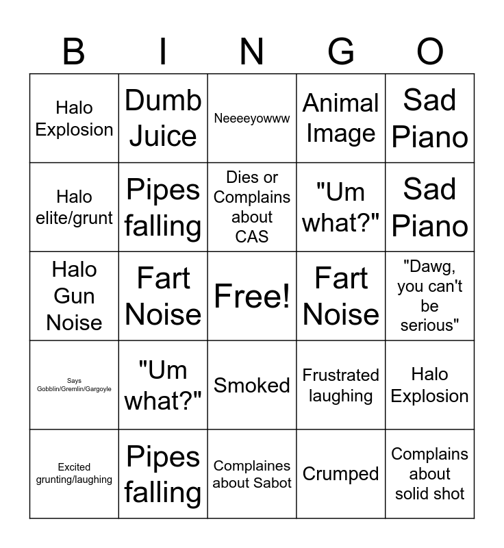 This bingo card has a free space and 54 words: Says Buster/Bub/Bozo, Says Gobblin/Gremlin/Gargoyle, Crumped, Clowned on, Smoked, Get outta here, Animal Image, Neeeeyowww, Halo elite/grunt, Halo Gun Noise, Halo Explosion, Halo Music, Pipes falling, Excited grunting/laughing, HL2 zombie noise, Complaines about Sabot, Complains about solid shot, "Um what?", "I am losing my mind", "Dawg, you can't be serious", Frustrated laughing, Dies or Complains about CAS, Fart Noise, Sad Piano, Skyrim Reference, Dumb Juice, Seismic Charge Explosion, Says Buster/Bub/Bozo, Says Goblin/Gremlin/Gargoyle, Crumped, Clowned on, Smoked, Get outta here, Animal Image, Neeeeyowww, Halo elite/grunt, Halo Gun Noise, Halo Explosion, Halo Music, Pipes falling, Excited grunting/laughing, HL2 zombie noise, Complains about Sabot, Complains about solid shot, "Um what?", "I am losing my mind", "Dawg, you can't be serious", Frustrated laughing, Dies or Complains about CAS, Fart Noise, Sad Piano, Skyrim Reference, Dumb Juice and Seismic Charge Explosion.