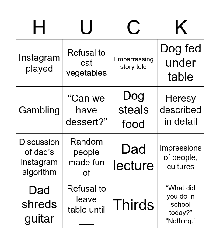 This bingo card has 24 words: Narf, Fart, Heresy described in detail, Kick under table/ cat attack, Gambling, Instagram played, “Can we have dessert?”, Refusal to eat vegetables, Refusal to leave table until ___, Caving and leaving table before ___, Discussion of dad’s instagram algorithm, Dad lecture, Mom lecture, Game played, Dog steals food, Seconds, Thirds, Embarrassing story told, Random people made fun of, Impressions of people, cultures, Dad shreds guitar, “What did you do in school today?” “Nothing.”, Dog fed under table and Terrible dad advice.