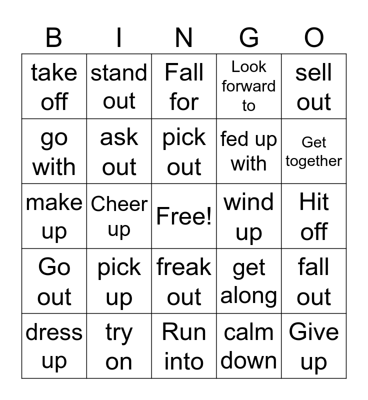 This bingo card has a free space and 24 words: pick up, try on, pick out, dress up, sell out, take off, go with, stand out, wind up, freak out, fed up with, make up, get along, fall out, ask out, calm down, Hit off, Fall for, Get together, Cheer up, Give up, Go out, Look forward to and Run into.