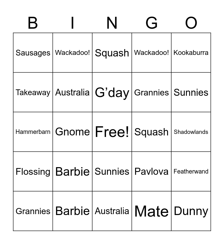 This bingo card has a free space and 39 words: Oh, biscuits!, Pavlova, Takeaway, Australia, Grannies, Sunnies, G’day, Rugby, Kookaburra, Flossing, Gnome, Wackadoo!, Dunny, Shadowlands, Squash, Barbie, Mate, Sausages, Oh, biscuits!, Pavlova, Takeaway, Australia, Grannies, Sunnies, G’day, Rugby, Kookaburra, Flossing, Gnome, Wackadoo!, Dunny, Shadowlands, Squash, Barbie, Mate, Sausages, Featherwand, Hammerbarn and Dollarbucks.