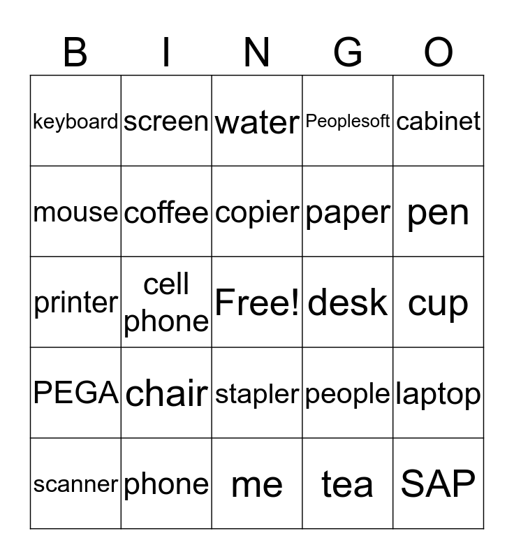 This bingo card has a free space and 24 words: chair, phone, copier, scanner, cabinet, keyboard, mouse, screen, desk, stapler, paper, printer, people, laptop, coffee, tea, cup, water, pen, cell phone, SAP, PEGA, Peoplesoft and me.