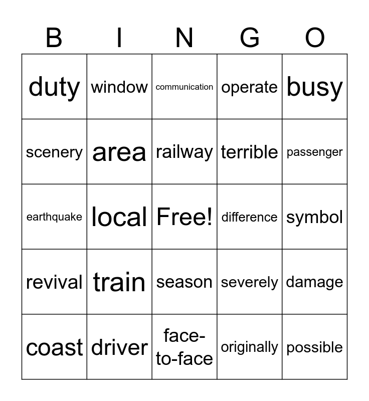 This bingo card has a free space and 24 words: train, driver, railway, coast, busy, duty, scenery, window, difference, season, terrible, earthquake, severely, damage, area, originally, symbol, communication, passenger, local, possible, revival, operate and face-to-face.