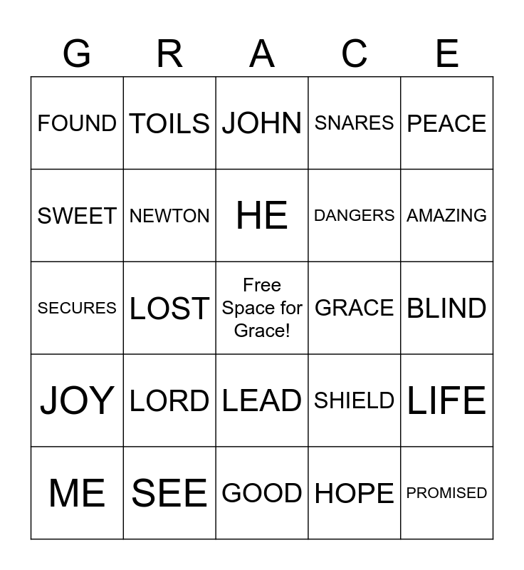 This bingo card has a free space and 29 words: ME, SAVED, LOST, SOUND, FOUND, JOHN, NEWTON, LORD, GRACE, SEE, BLIND, PROMISED, GOOD, HOPE, AMAZING, HOME, LEAD, JOY, PEACE, SECURES, SHIELD, WORD, DANGERS, SWEET, SNARES, TOILS, LIFE, HE and PREVAIL.