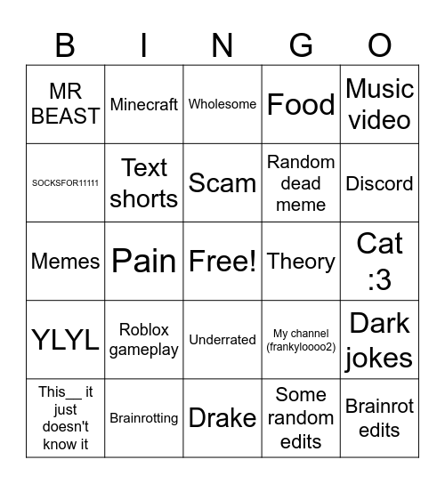 This bingo card has a free space and 24 words: This__ it just doesn't know it, Roblox gameplay, Scam, Some random edits, Music video, MR BEAST, Minecraft, Wholesome, Theory, Cat :3, Memes, Text shorts, My channel (frankyloooo2), Dark jokes, SOCKSFOR11111, Brainrotting, Drake, Food, Discord, YLYL, Pain, Underrated, Random dead meme and Brainrot edits.