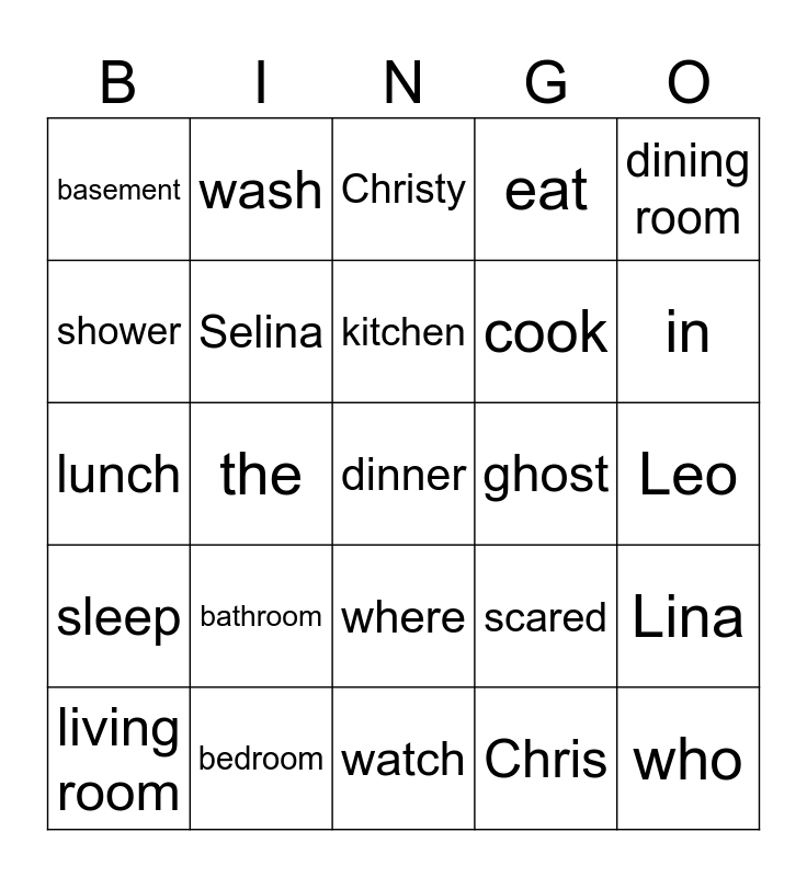 This bingo card has a free space and 24 words: bathroom, bedroom, kitchen, living room, dining room, basement, shower, wash, ghost, where, cook, lunch, scared, Lina, Selina, Chris, Leo, Christy, in, the, who, sleep, eat and watch.