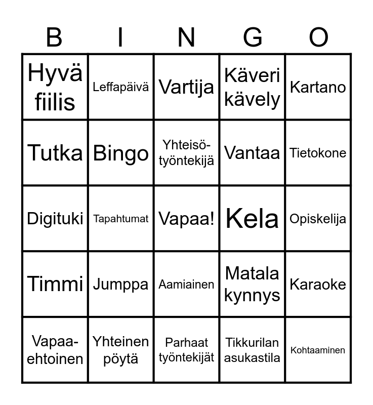 This bingo card has a free space and 29 words: Vapaa- ehtoinen, Ohjaaja, Tapahtumat, Kahvi, Hyvä fiilis, Vartija, Bingo, Jumppa, Kela, Yhteinen pöytä, Opiskelija, Kohtaaminen, Parhaat työntekijät, Tikkurilan asukastila, Tietokone, Korson asukastila, Aamiainen, Timmi, Kartano, Digituki, Matala kynnys, Myyrmäen asukastila, Vantaa, Tutka, Käveri kävely, Leffapäivä, Karaoke, Yhteisö- työntekijä and Hakunilan asukastila.