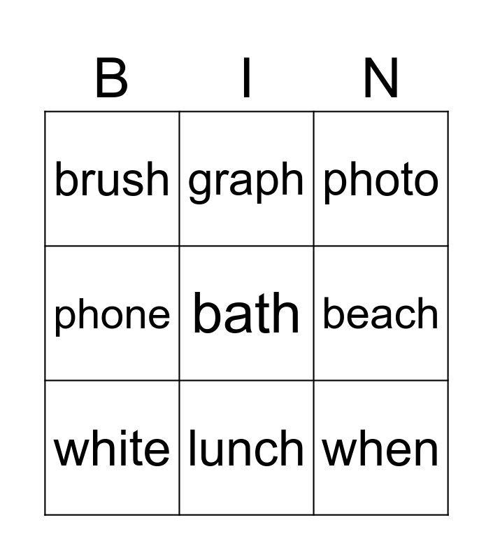 This bingo card has 10 words: lunch, photo, brush, bath, phone, white, graph, shop, beach and when.