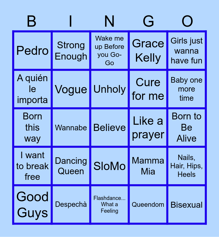 This bingo card has 40 words: I will survive, Born this way, Girls like girls, Vogue, Despechà, SloMo, Unholy, Don't stop believing, Girls just wanna have fun, I want to break free, Wannabe, Grace Kelly, Believe, Born to Be Alive, Like a prayer, Dancing Queen, Tanti Auguri, Pedro, La Revolución Sexual, Wake me up Before you Go-Go, Nails, Hair, Hips, Heels, Queendom, Cure for me, A quién le importa, I Kissed a Girl, Ni tú ni nadie, Man! I Feel Like a Woman!, Todos me miran, Bisexual, YMCA, Rise like a Phoenix, Good Guys, It's raining men, Mamma Mia, Baby one more time, Flashdance... What a Feeling, I Wanna Dance with Somebody, Zorra, Strong Enough and Sobreviviré.