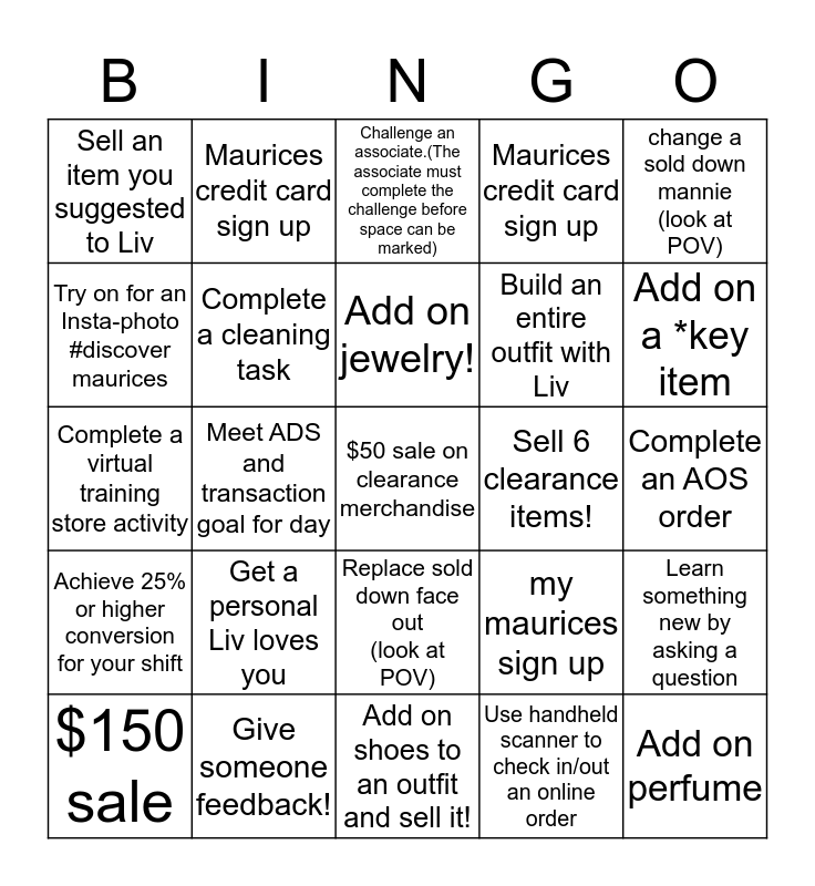 This bingo card has 25 words: Get a personal Liv loves you, Add on shoes to an outfit and sell it!, Add on jewelry!, $150 sale, change a sold down mannie (look at POV), Sell an item you suggested to Liv, Try on for an Insta-photo #discover maurices, Maurices credit card sign up, Sell 6 clearance items!, Replace sold down face out (look at POV), Build an entire outfit with Liv, Complete a virtual training store activity, my maurices sign up, Learn something new by asking a question, Complete a cleaning task, Add on perfume, Complete an AOS order, Challenge an associate.(The associate must complete the challenge before space can be marked), Add on a *key item, Meet ADS and transaction goal for day, $50 sale on clearance merchandise, Give someone feedback!, Achieve 25% or higher conversion for your shift, Maurices credit card sign up and Use handheld scanner to check in/out an online order.