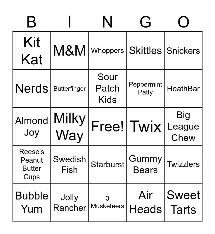 This bingo card has a free space and 24 words: Swedish Fish, Jolly Rancher, Sour Patch Kids, Bubble Yum, Snickers, Kit Kat, Nerds, M&M, Twix, Starburst, Peppermint Patty, Almond Joy, Gummy Bears, Twizzlers, Butterfinger, Air Heads, Big League Chew, Whoppers, HeathBar, Milky Way, Sweet Tarts, Reese's Peanut Butter Cups, Skittles and 3 Musketeers.