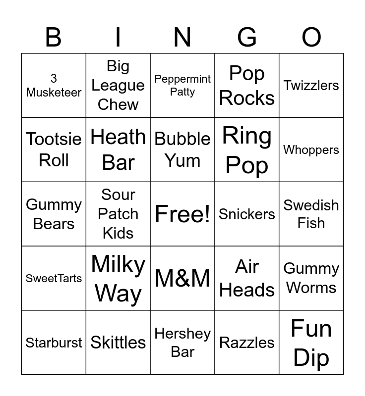 This bingo card has a free space and 33 words: Twix, Butterfinger, Sour Patch Kids, Reese's Peanut Butter Cups, SweetTarts, Heath Bar, Twizzlers, Starburst, Big League Chew, Almond Joy, Bubble Yum, Peppermint Patty, Kit Kat, Jolly Rancher, Snickers, Whoppers, Skittles, Gummy Bears, Milky Way, Air Heads, M&M, Nerds, 3 Musketeer, Swedish Fish, Hershey Bar, Fun Dip, Pop Rocks, Ring Pop, Tootsie Roll, Gummy Worms, Blow Pops, Razzles and Hubba Bubba.