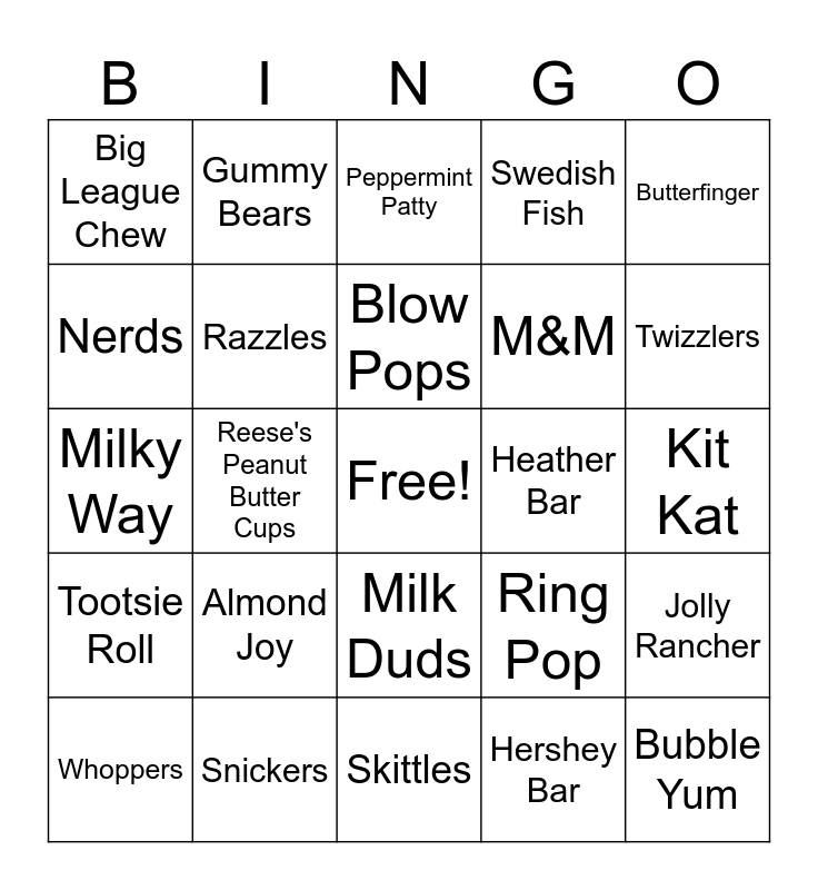 This bingo card has a free space and 36 words: Fun Dip, Pop Rocks, Gummy Worms, Razzles, Ring Pop, Tootsie Roll, Blow Pops, Twix, Butterfinger, Sour Patch Kids, Reese's Peanut Butter Cups, Swedish Fish, Sweet Tarts, Heather Bar, Twizzlers, Big League Chew, Starburst, Almond Joy, Bubble Yum, Peppermint Patty, Kit Kat, Jolly Rancher, Snickers, Whoppers, Skittles, Gummy Bears, Milky Way, Air Heads, M&M, Nerds, 3 Musketeers, Hot Tamales, Hershey Bar, Milk Duds, Sugar Daddy and Jelly Belly.