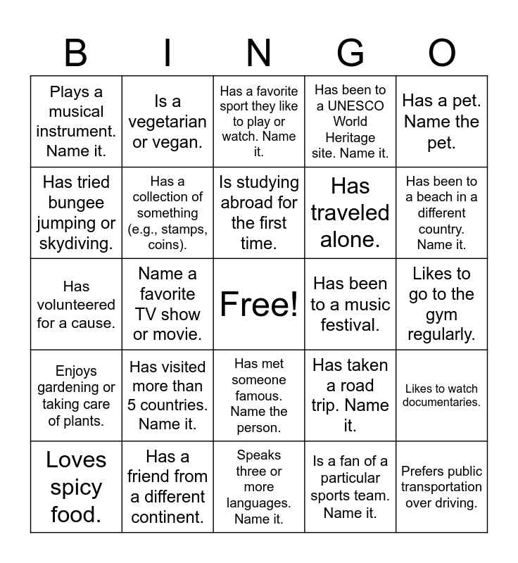 This bingo card has a free space and 25 words: Has visited more than 5 countries. Name it., Speaks three or more languages. Name it., Is studying abroad for the first time., Loves spicy food., Has a pet. Name the pet., Plays a musical instrument. Name it., Has tried bungee jumping or skydiving., Is a vegetarian or vegan., Has been to a music festival., Has met someone famous. Name the person., Has traveled alone., Has volunteered for a cause., Has taken a road trip. Name it., Likes to watch documentaries., Has a collection of something (e.g., stamps, coins)., In an NUS program., Likes to go to the gym regularly., Has a favorite sport they like to play or watch. Name it., Has been to a beach in a different country. Name it., Name a favorite TV show or movie., Prefers public transportation over driving., Has a friend from a different continent., Enjoys gardening or taking care of plants., Has been to a UNESCO World Heritage site. Name it. and Is a fan of a particular sports team. Name it..