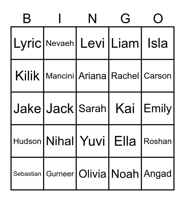This bingo card has a free space and 26 words: Yuvi, Noah, Ariana, Gurneer, Isla, Lyric, Kilik, Nevaeh, Emily, Ella, Rachel, Jake, Roshan, Sebastian, Jack, Sydnee, Liam, Hudson, Levi, Angad, Carson, Olivia, Kai, Nihal, Mancini and RIP Tod.