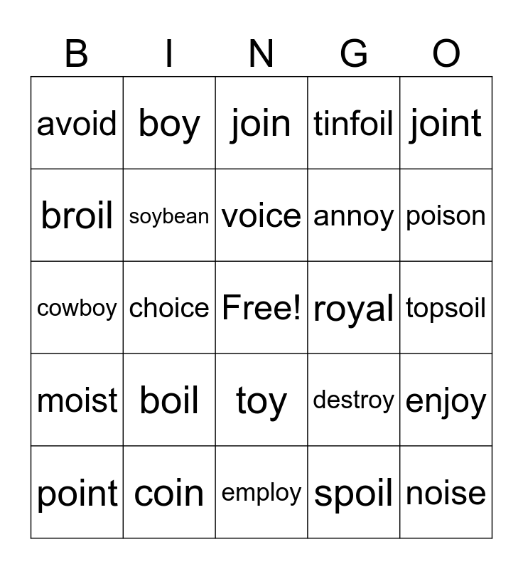 This bingo card has a free space and 24 words: boil, coin, voice, point, joint, avoid, broil, boy, royal, toy, annoy, cowboy, destroy, enjoy, soybean, spoil, topsoil, join, poison, choice, noise, moist, tinfoil and employ.