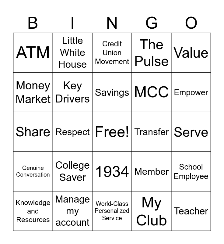 This bingo card has a free space and 42 words: Checking, Savings, Summer Saver, College Saver, My Club, School Employee, Teacher, Paycheck Planner, Credit Union Movement, 1934, Serve, Empower, Respect, Value, Embrace, Member, Teammember, Share, Bill Cheney, Little White House, Money Market, Share Certificate, Co-op, ATM, Greenpath, ROC, MCC, Zelle, Dividends, 90th Anniversary, SchoolsFirst, Genuine Conversation, Key Drivers, World-Class Personalized Service, Did things right the first time, Knowledge and Resources, Manage my account, Transfer, UTMA, Clearly answered my questions, The Pulse and Dream Team.