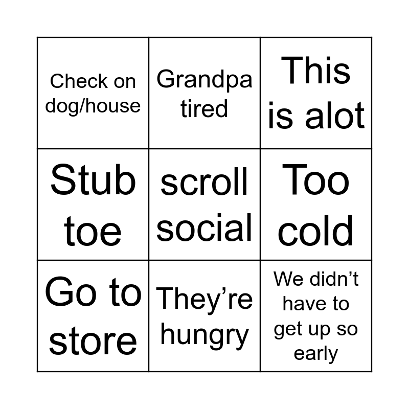 This bingo card has a free space and 8 words: Too cold, This is alot, Grandpa tired, Go to store, Check on dog/house, We didn’t have to get up so early, Stub toe and They’re hungry.