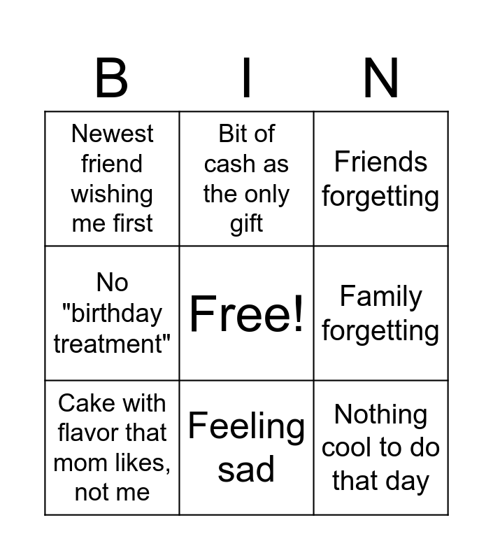 This bingo card has a free space and 8 words: Family forgetting, Friends forgetting, Bit of cash as the only gift, Cake with flavor that mom likes, not me, Newest friend wishing me first, Nothing cool to do that day, No "birthday treatment" and Feeling sad.