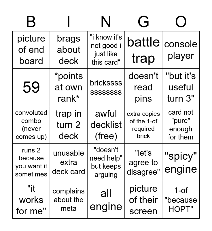 This bingo card has a free space and 24 words: "it works for me", unusable extra deck card, brickssss ssssssss, picture of their screen, console player, picture of end board, brags about deck, "i know it's not good i just like this card", extra copies of the 1-of required brick, card not "pure" enough for them, convoluted combo (never comes up), *points at own rank*, "let's agree to disagree", "spicy" engine, 59, complains about the meta, all engine, battle trap, "but it's useful turn 3", runs 2 because you want it sometimes, trap in turn 2 deck, "doesn't need help" but keeps arguing, doesn't read pins and 1-of "because HOPT".