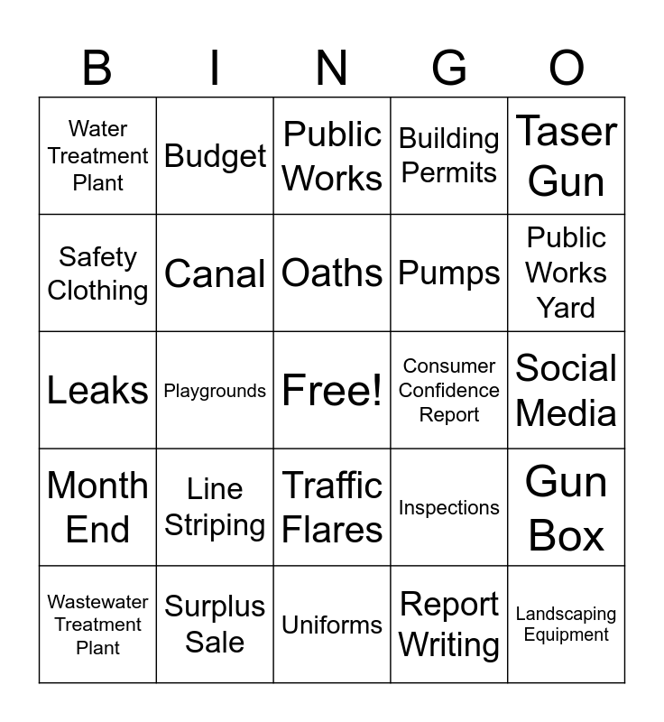 This bingo card has a free space and 84 words: Finance, Police, Public Works, Public Utilities, Building & Planning, Animal Control, Code Enforcement, City Clerk, City Council, Prison, Water Tanks, Water Ponds, Canal, Consumer Confidence Report, Sewer, Water Treatment Plant, Wastewater Treatment Plant, Safety Clothing, Safety Equipment, Lights, Parks, Pumps, Landscaping Equipment, Trees, Playgrounds, Sandbags, Roads, Flags, Baseball Diamond, Soccer Field, Line Striping, Public Right-of-Way, Utility Trucks, Leaks, Water Meters, Flowers, Uniforms, Electrical Equipment, Public Works Yard, Month End, Fiscal Year, Noise Permit, Yard Sale Permit, Accounts Payable, Accounts Receivable, Grants, Budget, Utility Bills, Business License, Plans, Planning Application, Inspections, Building Permits, Public Records Requests, Agendas, Agreements, Surplus Sale, Oaths, Website, Social Media, Commissions, Volunteers, Facility Use, Yanousch, SRO, CSO, Citation, Shotgun, Taser Gun, Police Vehicles, Gun Box, Evidence, Police Reports, 10-4, Traffic Flares, Report Writing, Code Seven, Glock 22, Siren, Communications Radio, Weed Abatement, Dog Pound, Benefits and Payroll.