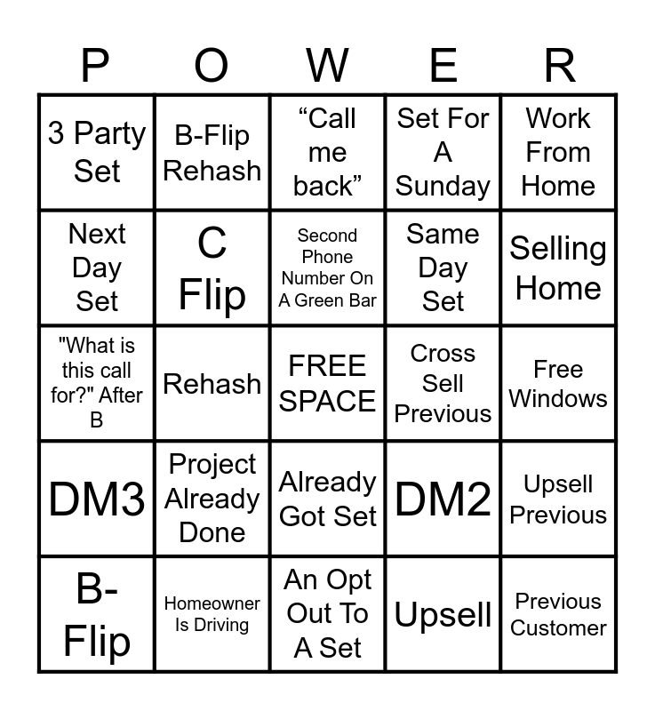 This bingo card has a free space and 31 words: An Opt Out To A Set, 3+ Day Gap To A Pullback, Rehash, Spouse Says No, 3 Party Set, “Call me back”, C Flip, DM2, Cross Sell Previous, Upsell, Free Windows, Previous Customer, Overnight Scheduling, Saturday Set, Selling Home, Opposite Schedule Set, Upsell Previous, Project Already Done, DM3, Already Got Set, Work From Home, Out Of Town, B-Flip, B-Flip Rehash, Same Day Set, Next Day Set, Set For A Sunday, "What is this call for?" After B, Homeowner Is Driving, Second Phone Number On A Green Bar and PowerHRG Green Bar.