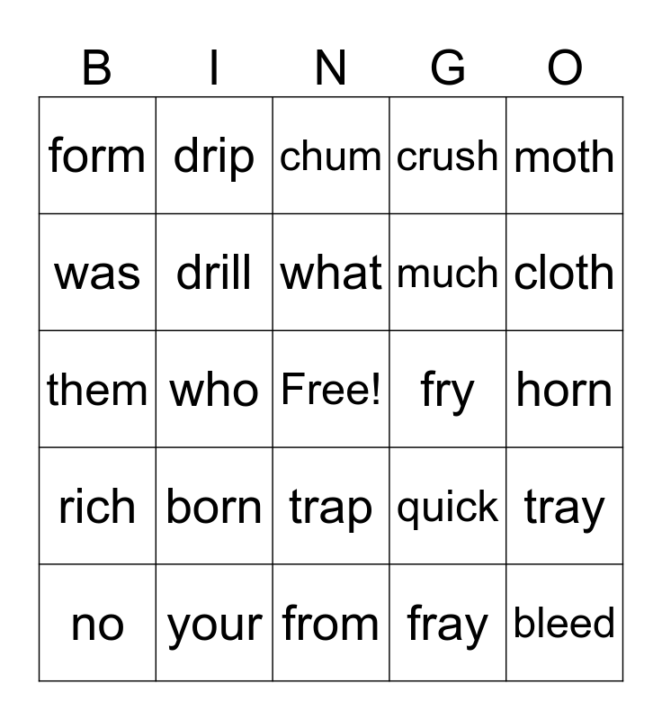 This bingo card has a free space and 74 words: chat, chess, chum, check, ball, stall, small, wall, no, we, she, be, what, was, are, who, thin, cloth, math, them, drill, drip, crush, crab, bleed, clap, flash, sleep, tenth, thud, moth, thorn, frog, free, fresh, fray, chip, chill, chop, chick, from, your, said, were, short, form, sport, born, dish, click, mesh, track, horn, sort, fort, storm, trap, trick, try, tray, much, such, rich, cry, fry, dry, spy, shy, quick, quit, press, prop, bluff and pluck.