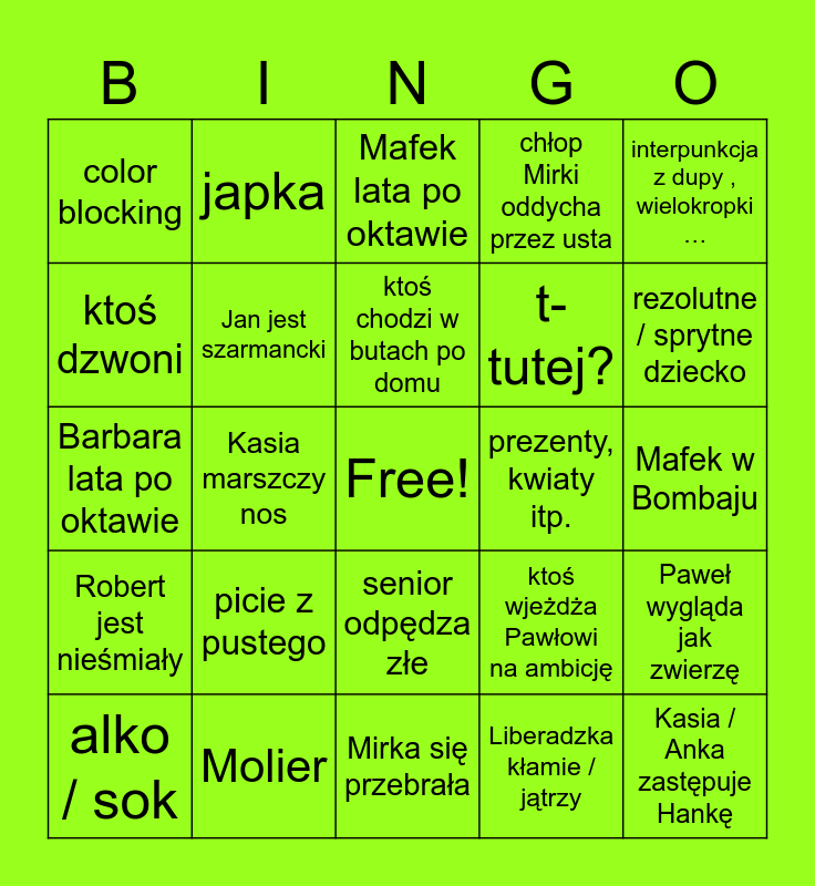 This bingo card has a free space and 24 words: picie z pustego, Molier, ktoś chodzi w butach po domu, alko / sok, interpunkcja z dupy , wielokropki …, color blocking, ktoś dzwoni, japka, prezenty, kwiaty itp., senior odpędza złe, t-tutej?, Barbara lata po oktawie, ktoś wjeżdża Pawłowi na ambicję, Paweł wygląda jak zwierzę, Jan jest szarmancki, Liberadzka kłamie / jątrzy, Mafek w Bombaju, Mafek lata po oktawie, rezolutne / sprytne dziecko, Kasia marszczy nos, Kasia / Anka zastępuje Hankę, Robert jest nieśmiały, chłop Mirki oddycha przez usta and Mirka się przebrała.