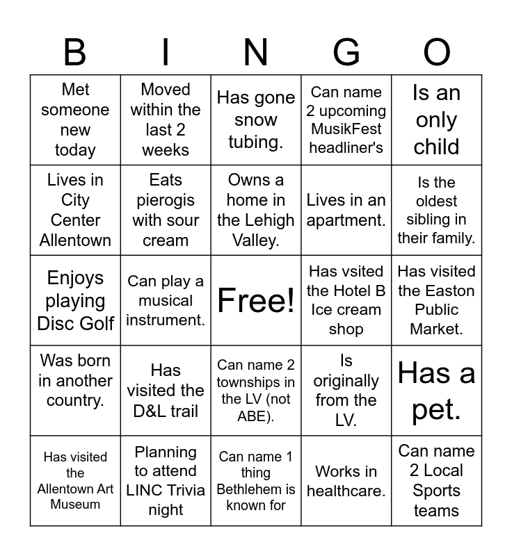 This bingo card has a free space and 24 words: Has visited the D&L trail, Planning to attend LINC Trivia night, Owns a home in the Lehigh Valley., Has visited the Allentown Art Museum, Is an only child, Met someone new today, Lives in City Center Allentown, Moved within the last 2 weeks, Has vsited the Hotel B Ice cream shop, Can name 2 townships in the LV (not ABE)., Lives in an apartment., Enjoys playing Disc Golf, Is originally from the LV., Has a pet., Eats pierogis with sour cream, Works in healthcare., Has visited the Easton Public Market., Has gone snow tubing., Is the oldest sibling in their family., Can play a musical instrument., Can name 2 Local Sports teams, Was born in another country., Can name 2 upcoming MusikFest headliner's and Can name 1 thing Bethlehem is known for.