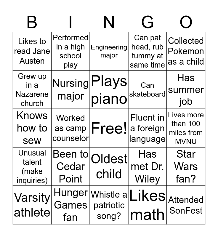 This bingo card has a free space and 24 words: Been to Cedar Point, Hunger Games fan, Plays piano, Varsity athlete, Collected Pokemon as a child, Likes to read Jane Austen, Grew up in a Nazarene church, Performed in a high school play, Fluent in a foreign language, Oldest child, Can skateboard, Knows how to sew, Has met Dr. Wiley, Star Wars fan?, Nursing major, Likes math, Lives more than 100 miles from MVNU, Engineering major, Has summer job, Worked as camp counselor, Attended SonFest, Unusual talent (make inquiries), Can pat head, rub tummy at same time and Whistle a patriotic song?.