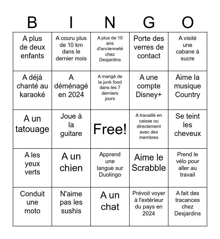 This bingo card has a free space and 24 words: A un chien, N'aime pas les sushis, A mangé de la junk food dans les 7 derniers jours, Conduit une moto, A visité une cabane à sucre, A plus de deux enfants, A déjà chanté au karaoké, A couru plus de 10 km dans le dernier mois, A travaillé en caisse ou directement avec des membres, Apprend une langue sur Duolingo, A une compte Disney+, A un tatouage, Aime le Scrabble, Prend le vélo pour aller au travail, A déménagé en 2024, Prévoit voyer à l'extérieur du pays en 2024, Se teint les cheveux, A plus de 10 ans d'ancienneté chez Desjardins, Aime la musique Country, Joue à la guitare, A fait des tracances chez Desjardins, A les yeux verts, Porte des verres de contact and A un chat.