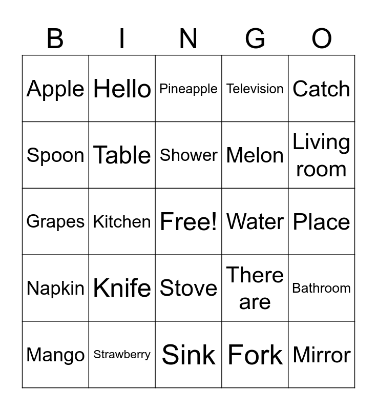 This bingo card has a free space and 28 words: Bathroom, Water, Melon, Fork, Spoon, Pineapple, Hello, Napkin, Water, Mango, Grapes, Television, Strawberry, Sink, Living room, Sofa, Knife, Table, Shower, Stove, Apple, Watermelon, Mirror, Kitchen, Place, There are, Catch and There is.