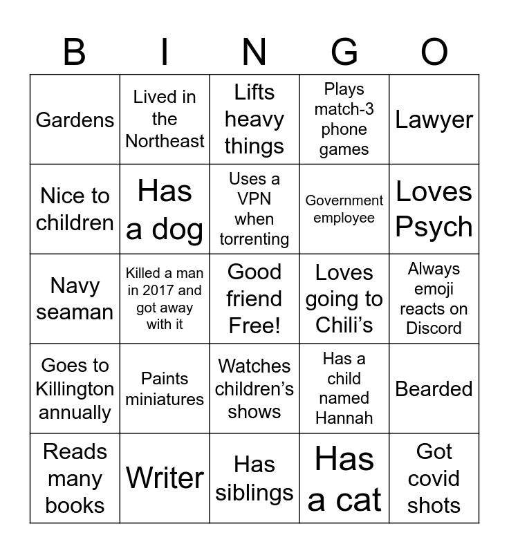 This bingo card has a free space and 24 words: Paints miniatures, Writer, Uses a VPN when torrenting, Reads many books, Lawyer, Gardens, Nice to children, Lived in the Northeast, Loves going to Chili’s, Watches children’s shows, Government employee, Navy seaman, Has a child named Hannah, Bearded, Has a dog, Has a cat, Always emoji reacts on Discord, Lifts heavy things, Loves Psych, Killed a man in 2017 and got away with it, Got covid shots, Goes to Killington annually, Plays match-3 phone games and Has siblings.
