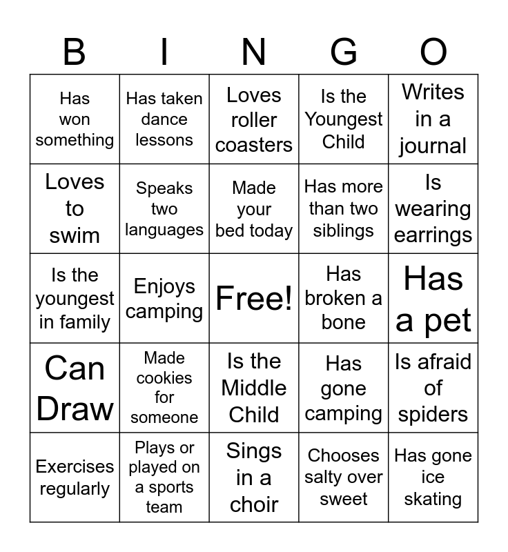 This bingo card has a free space and 71 words: Is wearing blue, Has taken dance lessons, Loves to garden, Likes tomatoes, Has a pet, Plays a musical instrument, Speaks two languages, Has been to the ocean, Has broken a bone, Has been in a play, Loves to swim, Owns a pair of flip flops, Has gone camping, Writes in a journal, Likes to cook, Enjoys camping, Is the Middle Child, Is the Youngest Child, Visited another country, Has won something, Made cookies for someone, Sings in a choir, Has family in Utah, Has gone ice skating, Likes to read, Has taken piano lessons, Never Touched Snow, Has a dog, Has baked bread, Plays an instrument, Has run a 5K, Has brown eyes, Has naturally curly hair, Has Blue Eyes, Is the youngest in family, Has had stitches, Never been to Disneyland, Likes sushi, Is wearing earrings, Exercises regularly, Plays or played on a sports team, Favorite season is summer, Gave a compliment today, Likes to go fishing, Wears glasses, Born in June, July or August, Is a lefty, Has more than two siblings, Did not have soda pop today, Favorite pizza is pepperoni, Born in another state, Never walked to school, Taught a lesson, Is afraid of spiders, Likes chocolate, Eats vegetables daily, Made your bed today, Has more than three sibilings, Knows the Primary Colors, Knows how to knit, Favorite color is purple, Was born in December, Chooses salty over sweet, Only has brothers, Does not drink milk, Has/Had braces, Loves roller coasters, Has allergies, Plays Basketball, Can Draw and Can whistle.