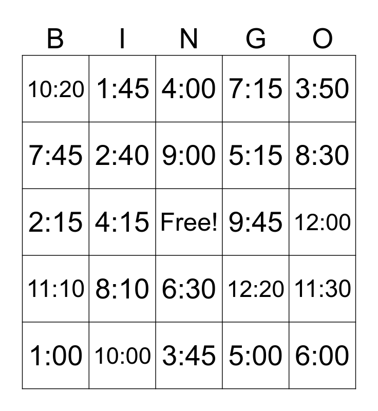 This bingo card has a free space and 24 words: 8:10, 10:00, 9:00, 1:00, 3:50, 10:20, 7:45, 1:45, 9:45, 6:30, 5:15, 2:15, 12:20, 11:30, 2:40, 5:00, 12:00, 4:00, 8:30, 4:15, 6:00, 11:10, 7:15 and 3:45.