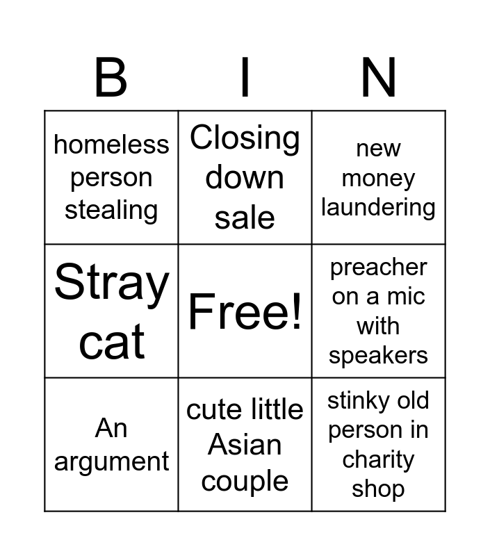 This bingo card has a free space and 8 words: preacher on a mic with speakers, new money laundering, Closing down sale, An argument, homeless person stealing, stinky old person in charity shop, Stray cat and cute little Asian couple.