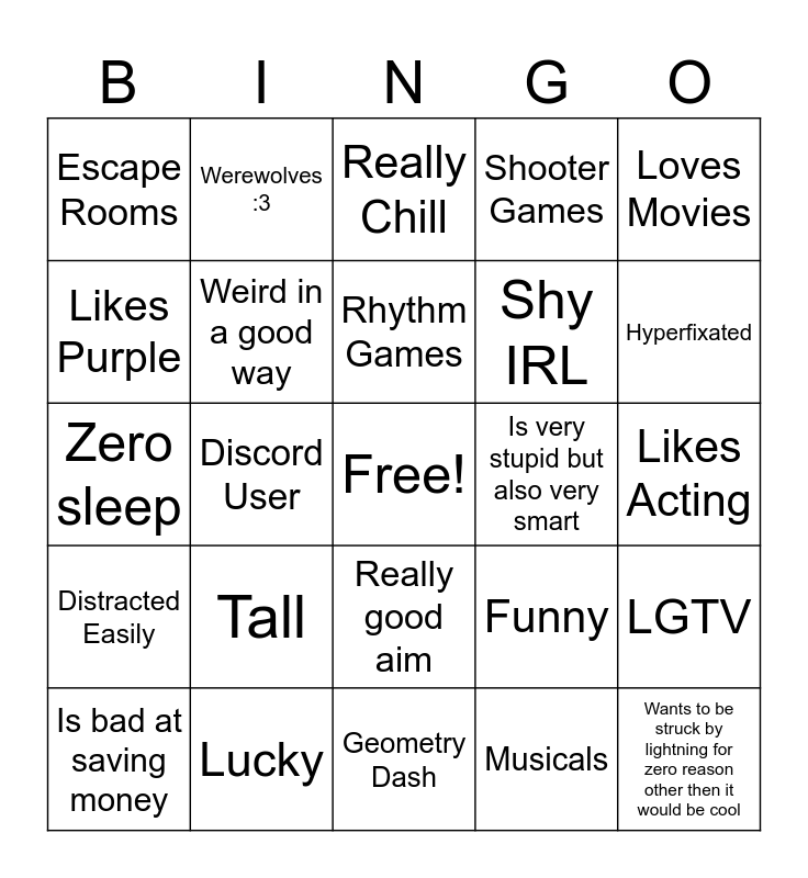 This bingo card has a free space and 24 words: Tall, Lucky, Rhythm Games, Is bad at saving money, Loves Movies, Escape Rooms, Likes Purple, Werewolves :3, Is very stupid but also very smart, Really good aim, Shy IRL, Zero sleep, Funny, LGTV, Weird in a good way, Musicals, Likes Acting, Really Chill, Hyperfixated, Discord User, Wants to be struck by lightning for zero reason other then it would be cool, Distracted Easily, Shooter Games and Geometry Dash.