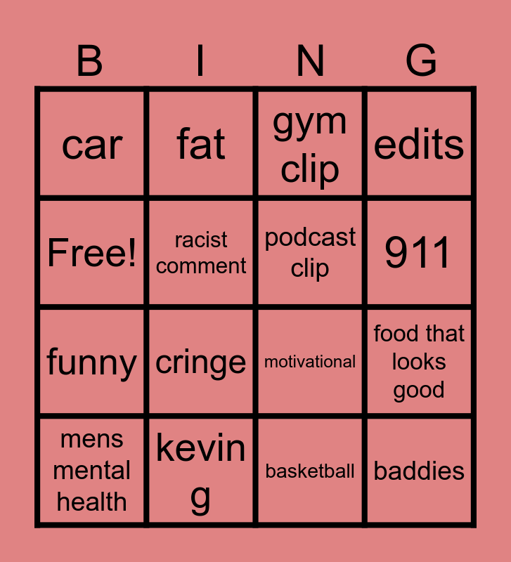 This bingo card has 16 words: kevin g, food that looks good, gym clip, car, funny, fat, motivational, basketball, Free!, racist comment, mens mental health, edits, cringe, 911, podcast clip and baddies.