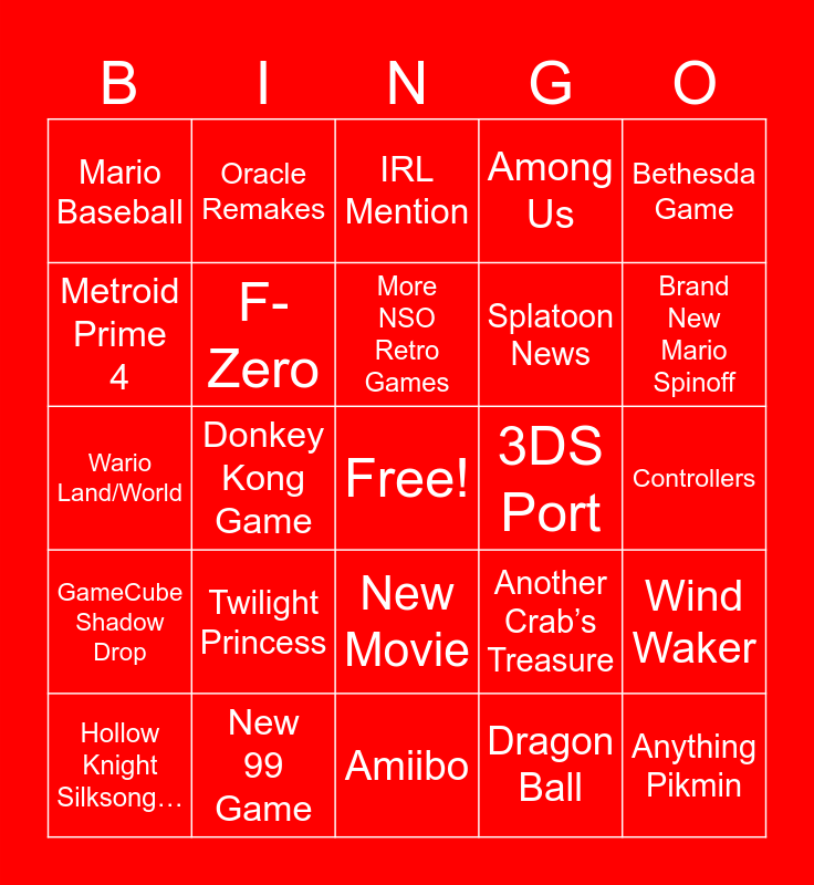This bingo card has a free space and 24 words: Twilight Princess, New 99 Game, More NSO Retro Games, Hollow Knight Silksong…, Bethesda Game, Mario Baseball, Metroid Prime 4, Oracle Remakes, 3DS Port, New Movie, Splatoon News, Wario Land/World, Another Crab’s Treasure, Wind Waker, F-Zero, Dragon Ball, Controllers, IRL Mention, Brand New Mario Spinoff, Donkey Kong Game, Anything Pikmin, GameCube Shadow Drop, Among Us and Amiibo.